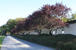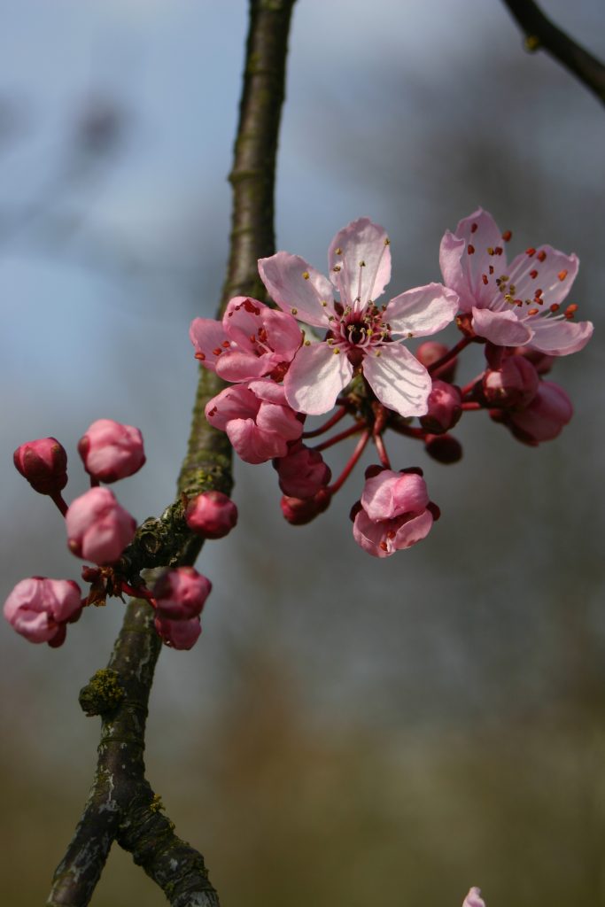 Rundkronigt träd med mycket mörkt intryck. Stammen, de långa tunna grenarna och årsskotten är mörkröda till bruna. Bladen är mycket mörkt purpurröda och slår ut samtidigt som den spektakulära blomningen äger rum. En stor mängd rosa blommor får trädet att lysa upp under maj. En fåtal mörkt purpurfärgade plommon kan bildas.